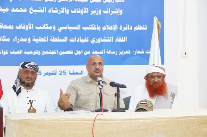 عُقد، السبت، في مدينة المخا لقاء تشاوري للسلطة المحلية ومكاتب الأوقاف بمحافظتي تعز والحديدة، برعاية وحضور الفريق الركن طارق صالح نائب رئيس مجلس القيادة- قائد المقاومة