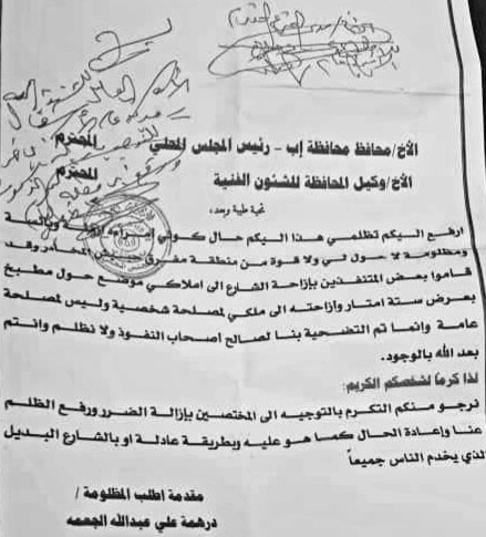اتهم مواطنون في محافظة إب، مدير مكتب الأشغال بمديرية المخادر المعيَّن من قِبل مليشيا الحوثي، المدعو "غمدان الوصابي"، بالتلاعب في مخطط أحد الطرق العامة بمنطقة مفرق