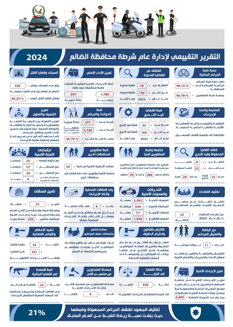 نفذت شرطة الضالع 2563 مهمة أمنية و4495 دورية أمنية، بالإضافة إلى تأمين 33 منشأة حيوية؛ كما تم تنفيذ 71 حملة أمنية و1458 مهمة قتالية لضمان حماية الأمن العام.