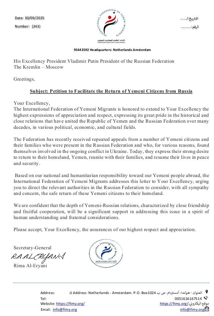 ناشد الاتحاد العالمي للمهاجرين اليمنيين، الأربعاء، الرئيس الروسي فلاديمير بوتين، التدخل العاجل والسماح للمواطنين اليمنيين المتواجدين في جبهات القتال داخل الأراضي الروسية بالعودة الآمنة إلى وطنهم، بعد انتهاء العقود المبرمة معهم.