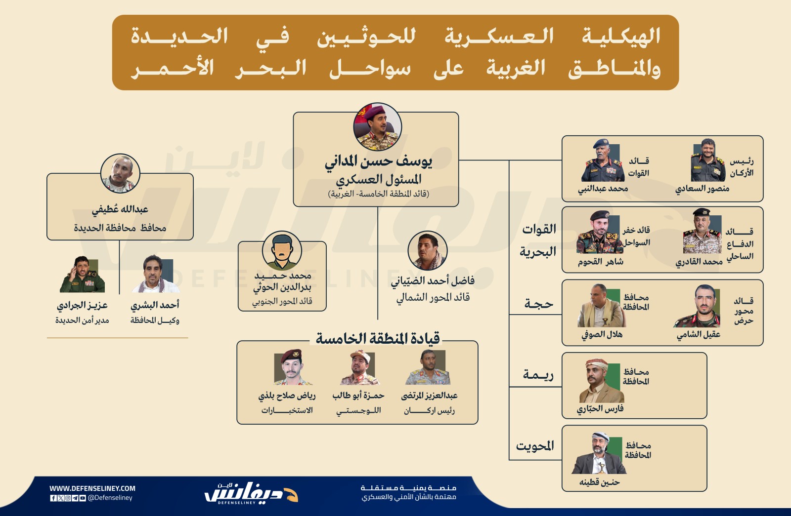 ويبرز في التقرير اسم اللواء يوسف حسن المداني (أبو حسين)، المقرّب من زعيم المليشيا عبدالملك الحوثي، والذي يتولى قيادة «المنطقة العسكرية الغربية» ومقرها الحديدة، ويُوصف بأنه "حارس البحر الأحمر وقناص السفن".. كما يضم الهيكل العسكري في المنطقة قيادات نافذة مثل عبدالعزيز المرتضى، وحمزة أبو طالب، ومحسن أبو غيدنة، إلى جانب قادة أمنيين واستخباريين يديرون شبكة مترابطة من القوات البرية والبحرية والدفاع الساحلي وخفر السواحل.