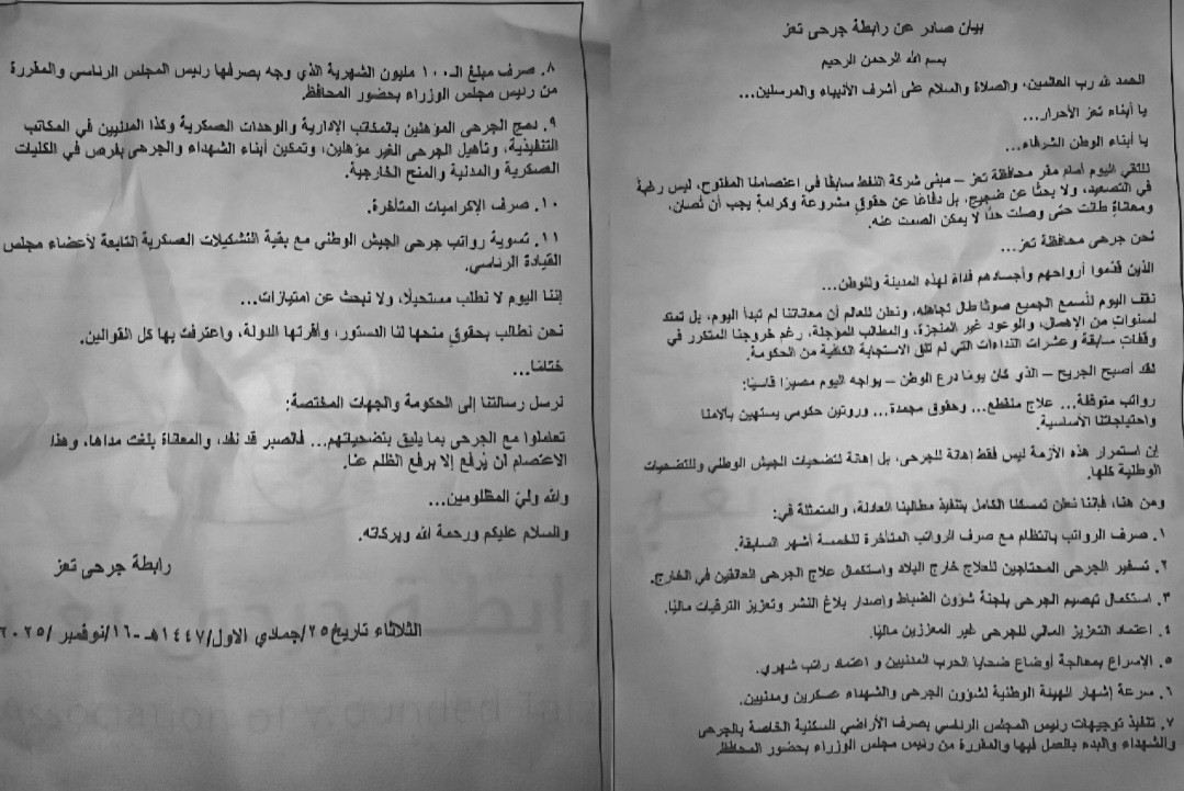 أعلن جرحى الجيش في محافظة تعز، الأحد، بدء اعتصام مفتوح أمام مقر السلطة المحلية في شارع جمال، احتجاجاً على ما وصفوه باستمرار "الإهمال الحكومي" تجاه ملف