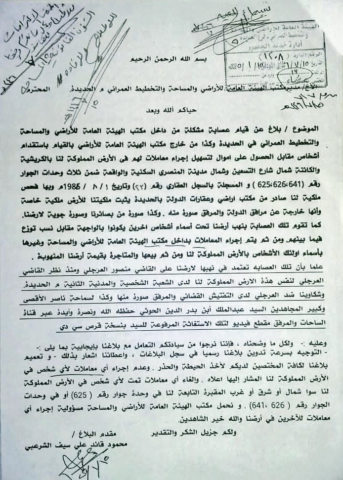 وثيقة رسمية تكشف فساداً حوثياً منظماً في هيئة أراضي الحديدة
