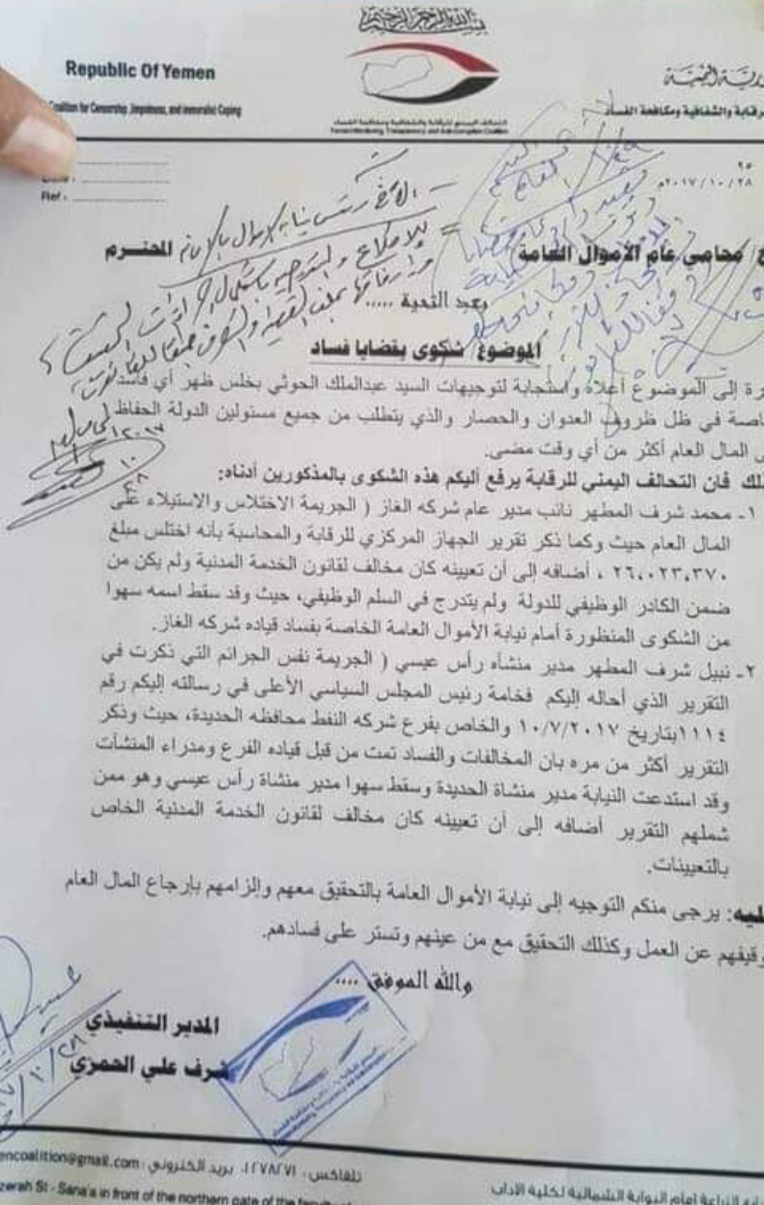 أظهرت وثيقة صادرة عن "التحالف الوطني للرقابة والشفافية ومكافحة الفساد" تورط محمد شرف المطهر، وزير التجارة والصناعة في حكومة الحوثيين في صنعاء، وشقيقه نبيل المطهر، رئيس