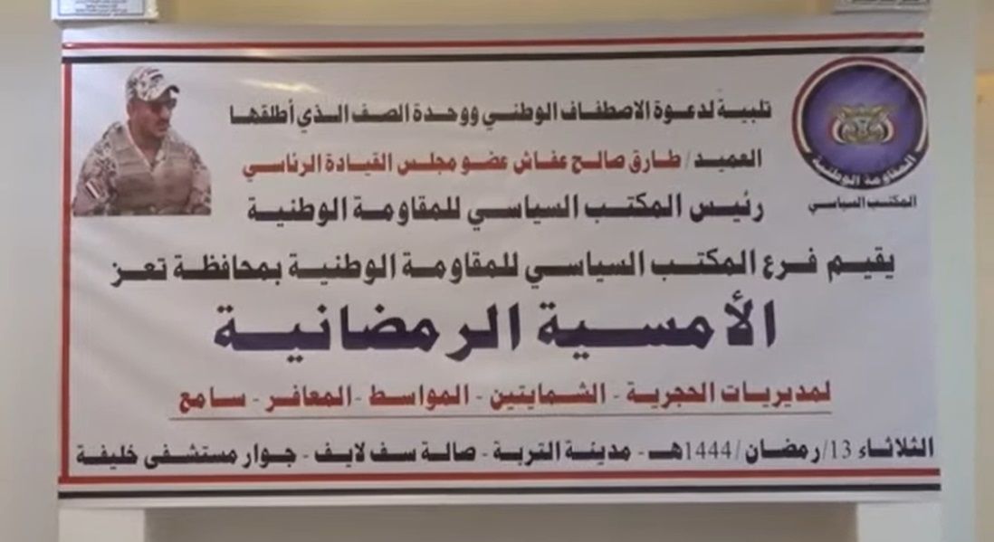تزامنا مع الذكرى الرابعة لتحرير مدينة قعطبه وترجمة لدعوة العميد الركن طارق محمد صالح أقام المكتب السياسي للمقاومة الوطنية بمحافظة إب أمسية رمضانية موسعه لقيادات وأبناء