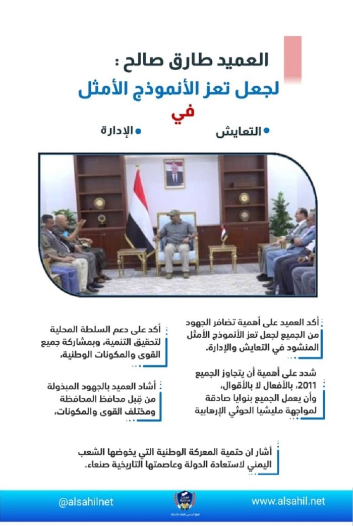 وجّه الفريق #طارق_صالح برفع وتيرة التدريب وتكثيف التواصل مع المواطنين في المناطق المنكوبة بسيطرة الحوثيين، مؤكداً لهم أن المعركة آتية لا محالة وأن ساعة الخلاص أصبحت أقرب من أي وقت مضى