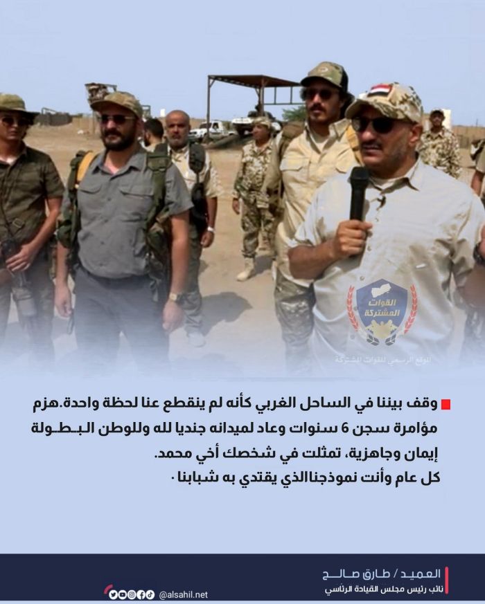 جدد الفريق #طارق_صالح التأكيد أن المقاومة الوطنية باقية على عهدها وهدفها: «مواجهة الحوثي وتحرير العاصمة المختطفة»، رافضاً الانجرار لأي مواجهة داخل المناطق المحررة أو إهدار الجهود في صراعات لا تخدم المعركة الكبرى