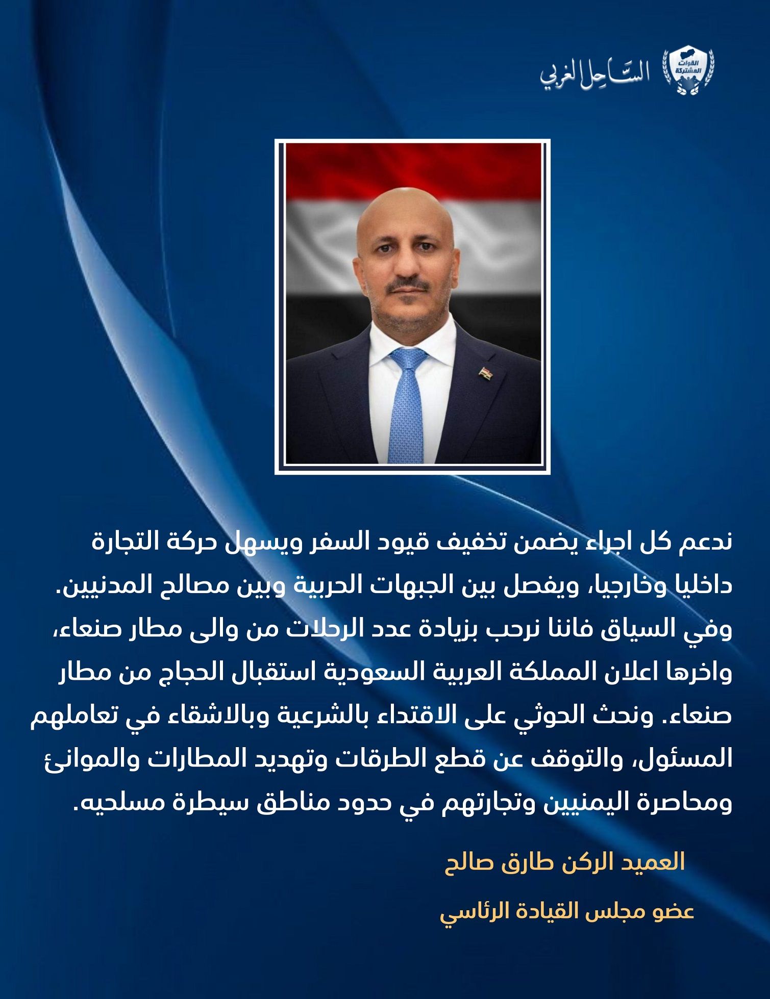 جدد الفريق #طارق_صالح الإشادة بدور التحالف العربي، لافتاً إلى أن استمرار الدعم مرتبط بتوحيد الجهود الوطنية ورفع مستوى التنسيق بين المكونات اليمنية