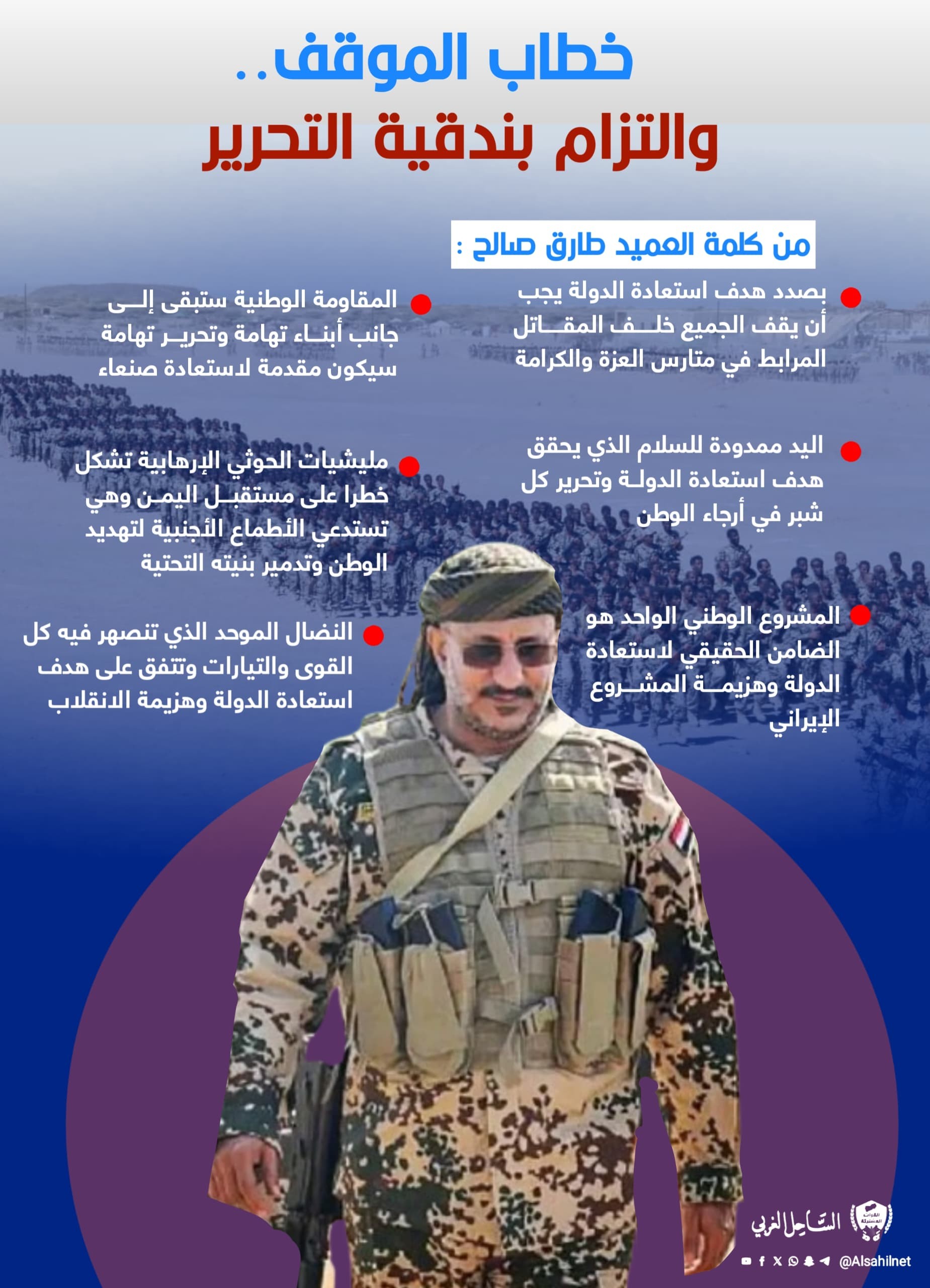 جدد الفريق #طارق_صالح التأكيد أن المقاومة الوطنية باقية على عهدها وهدفها: «مواجهة الحوثي وتحرير العاصمة المختطفة»، رافضاً الانجرار لأي مواجهة داخل المناطق المحررة أو إهدار الجهود في صراعات لا تخدم المعركة الكبرى