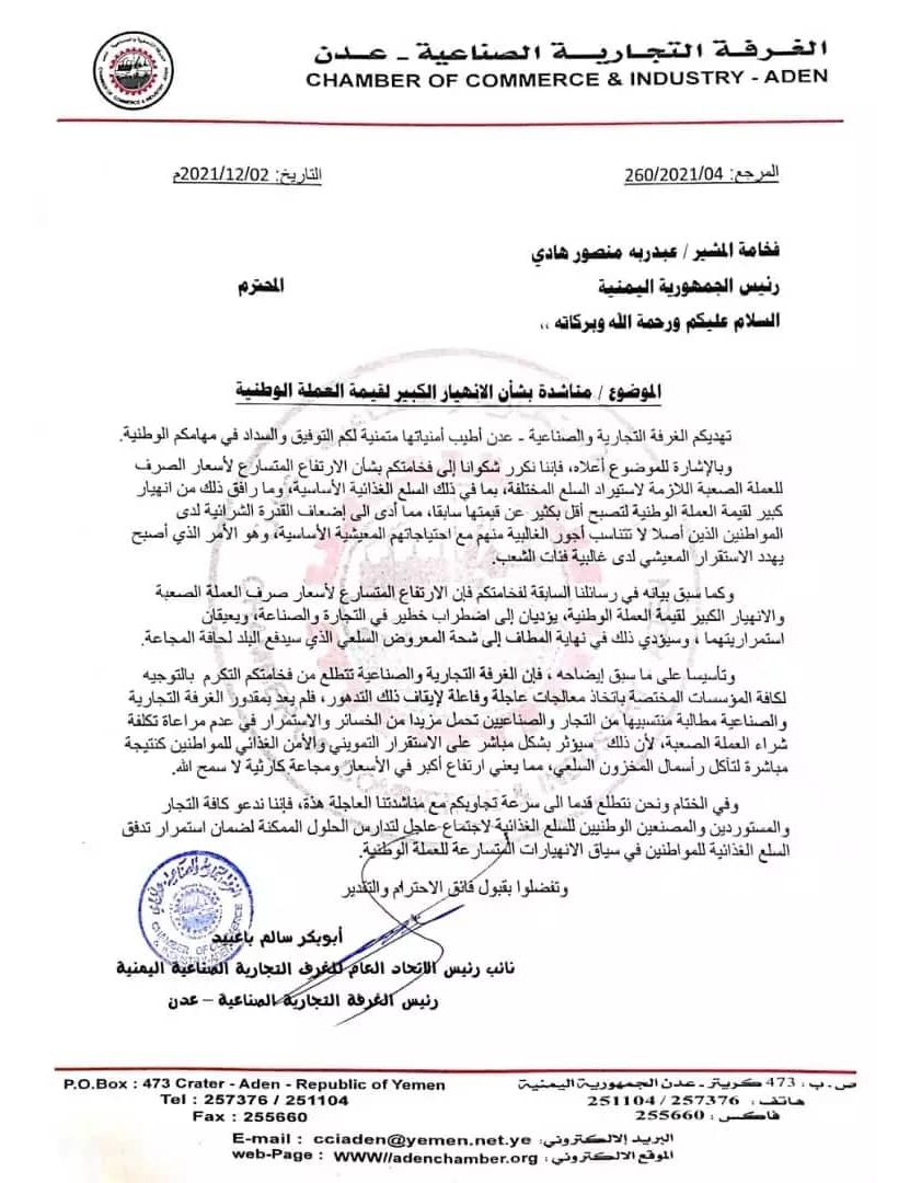 ناشدت الغرفة التجارية والصناعية بالعاصمة عدن، الخميس 2ديسمبر/تشرين ثاني 2021، الرئيس هادي بالتدخل لإيقاف "الانهيار الكبير" للعملية المحلية مقابل العملات الأجنبية وانقاذ البلاد من مجاعة كارثية.