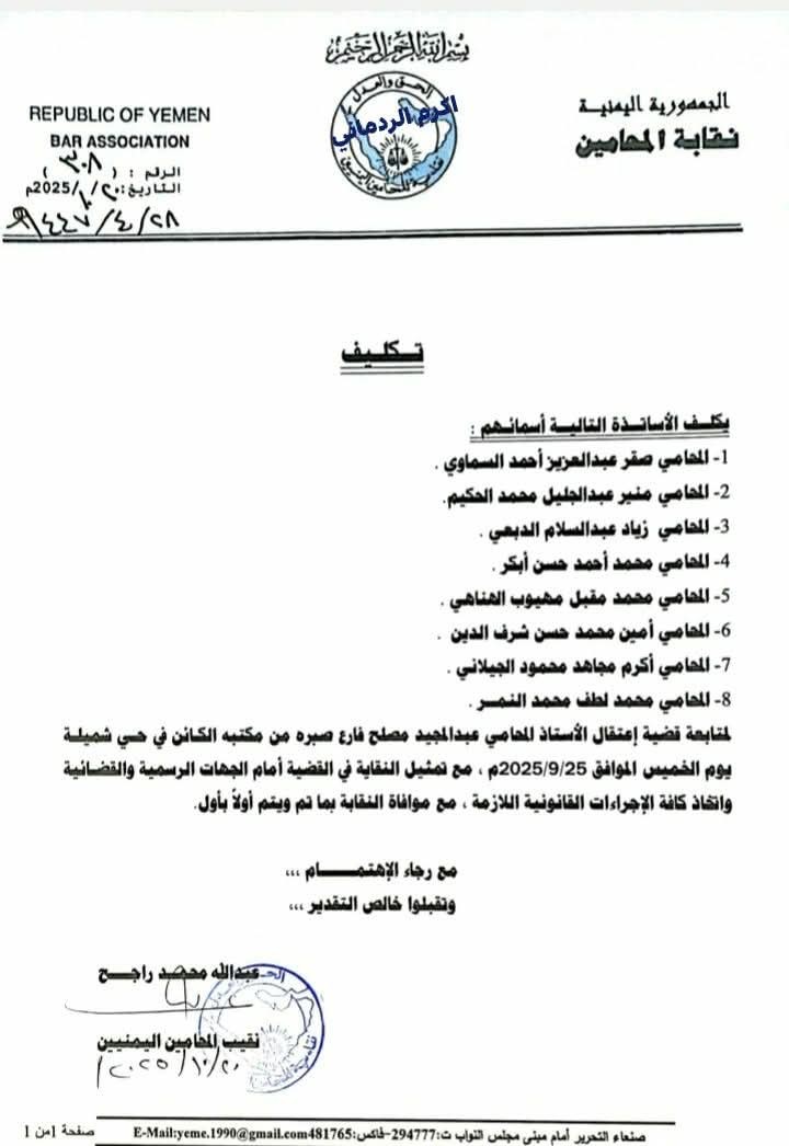 أعلنت نقابة المحامين اليمنيين عن تكليف فريق قانوني مكوّن من ثمانية محامين لمتابعة قضية اختطاف عضو النقابة المحامي عبدالمجيد صبرة، الذي اختطفته مليشيا الحوثي من مكتبه