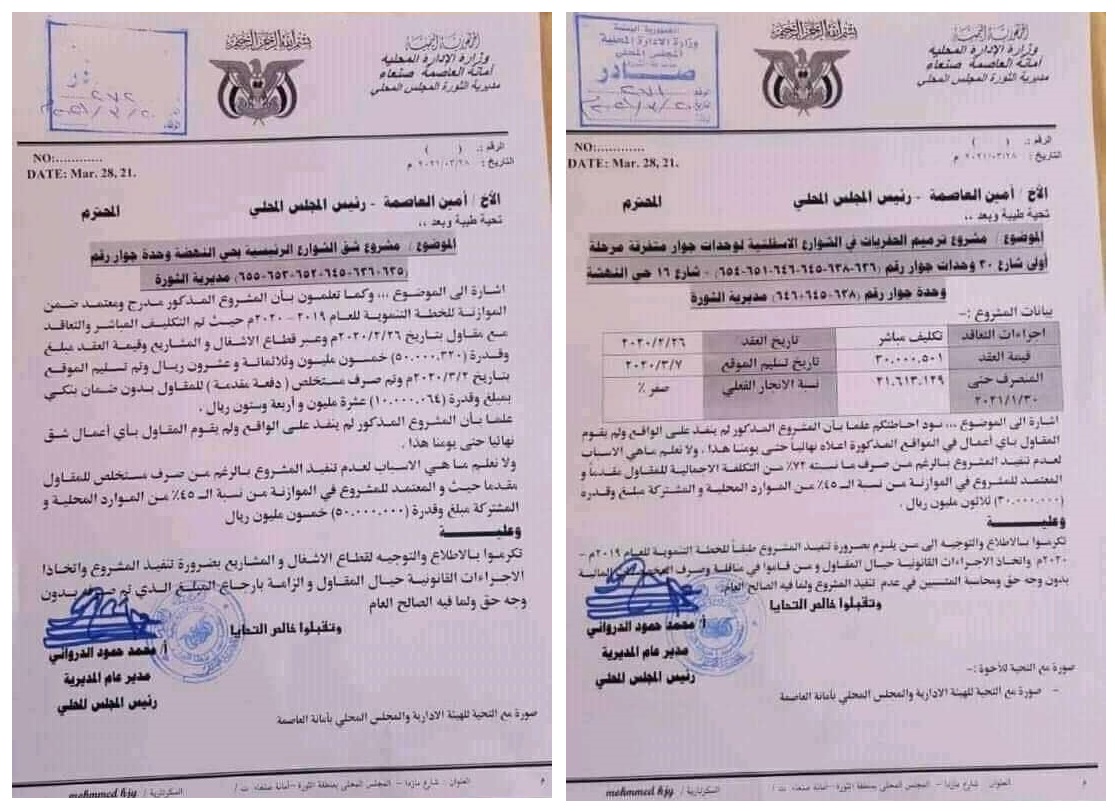 وأكدت الوثيقة، وهي بلاغ موجه من مديرية الثورة إلى أمين العاصمة، أن المشروع ”لم ينفذ على الواقع نهائيا“ حتى تاريخ 20 مارس2021. أي بعد انقضاء عام كامل، داعية إلى توجيه قطاع الأشغال والمشاريع بتنفيذه ومعاقبة المقاول وإلزامه بإرجاع المبلغ المصروف ”بدون وجه حق “.