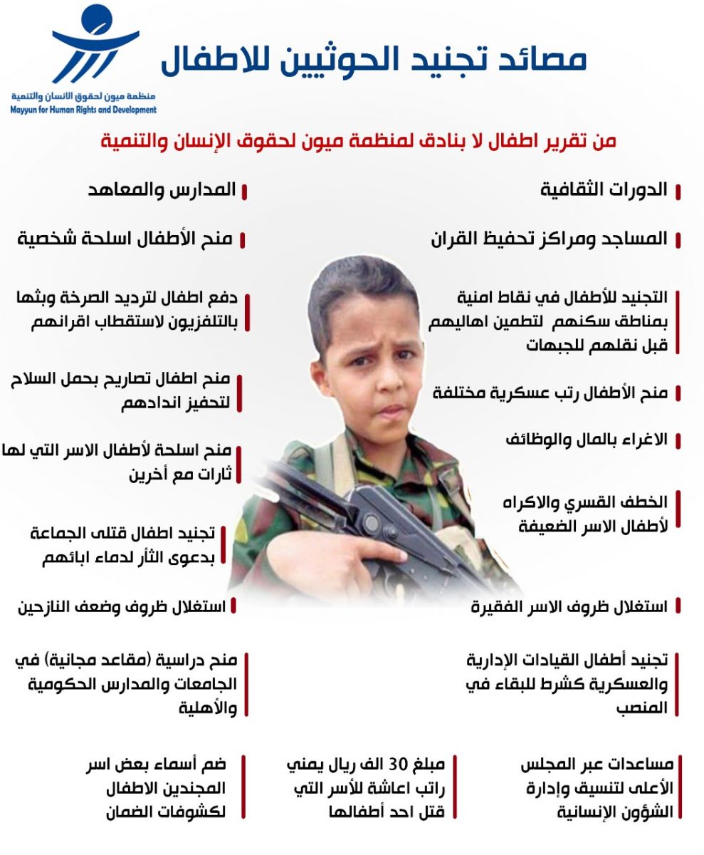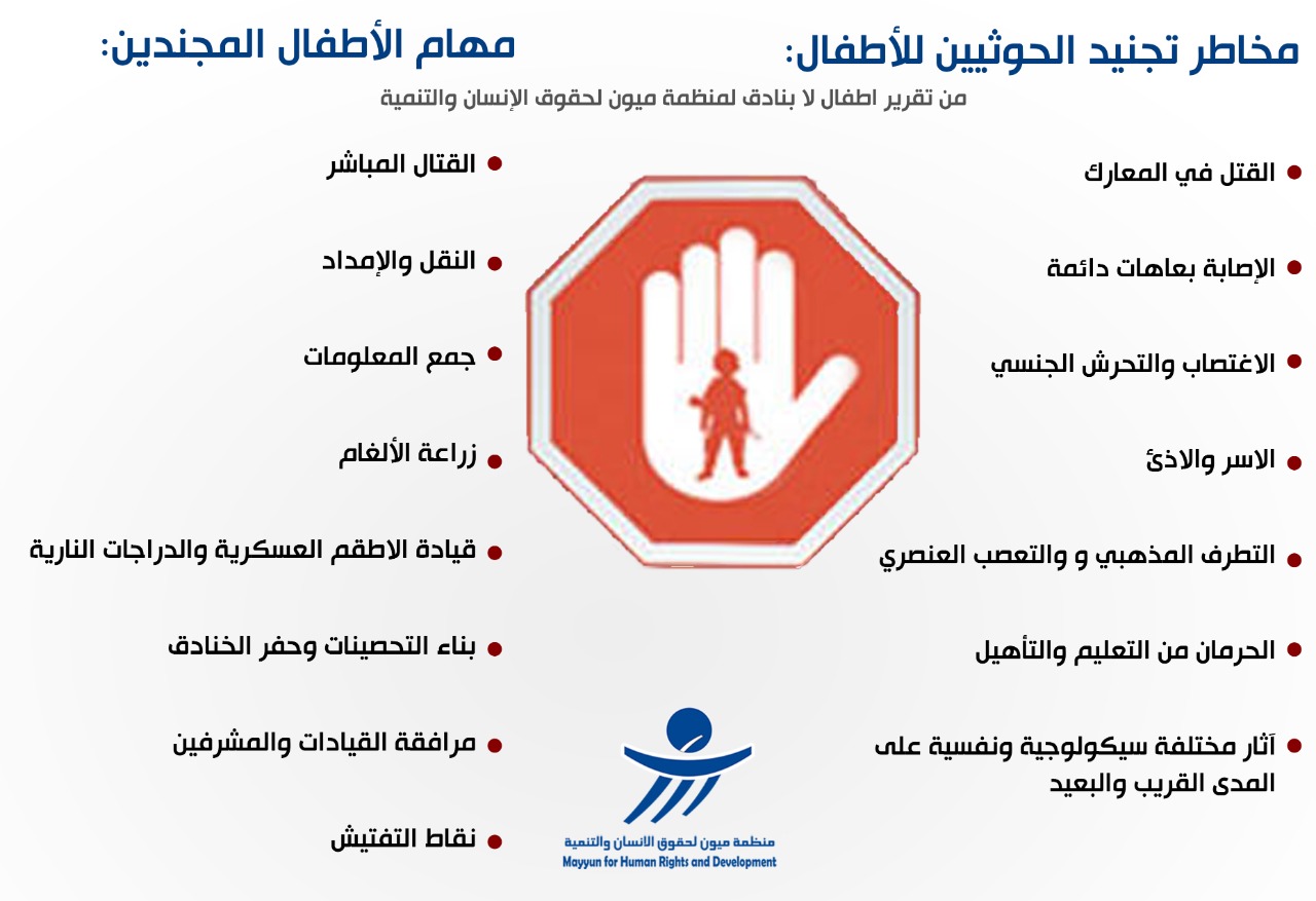 وبين، أن الحوثيين، يجبرون الأطفال على تنفيذ مهام كالقتال المباشر، ونقل الإمداد وجمع المعلومات، وزراعة الألغام، وقيادة السيارات والدراجات النارية، وبناء التحصينات والخنادق، ومرافقة القيادات والمشرفين، وكذلك العمل في نقاط التفتيش. ما يعرضهم للقتل أو الأسر، والإصابات بعاهات مستديمة.