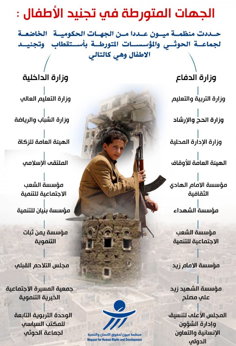 وتضمن التقرير قائمة بأسماء ابرز قيادات جماعة الحوثي المتورطين في استقطاب وتجنيد الأطفال، حيث وثقت المنظمة من خلال فريق الرصد الميداني في امانة العاصمة صنعاء والمحافظات الخاضعة لسيطرتهم تورط عدد (125) قياديا بعمليات تجنيد الأطفال وفي مقدمتهم يحيى بدر الدين الحوثي ومحمد علي الحوثي ومحمد بدر الدين الحوثي وعبد الكريم امير الدين الحوثي وعبد المجيد الحوثي واحمد درهم المؤيدي واحمد محمد حامد وعبده المحسن الطاووس وضيف الله رسام. كما كشف المنظمة عن اسماء عدد (22) جهة ايضا متورطة في عمليات تجنيد الأطفال في مناطق سيطرة الحوثيين.
