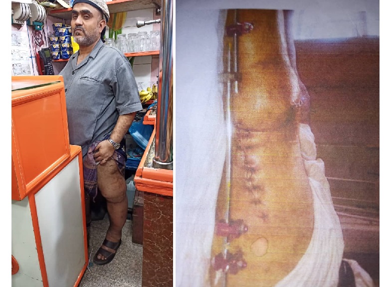 يلفت الرجل في حديثه: "شوف رجلي الآن كيف هي مُتورمة (أي كبيرة) فيها احتقان سوائل.. والصفيحة مع المسامير عادها فوق العظم.. يحتاج إلى عملية لإخراجهم.. بتكون العملية الرابعة، خسارة وتعب". معاناة لا تنتهي.