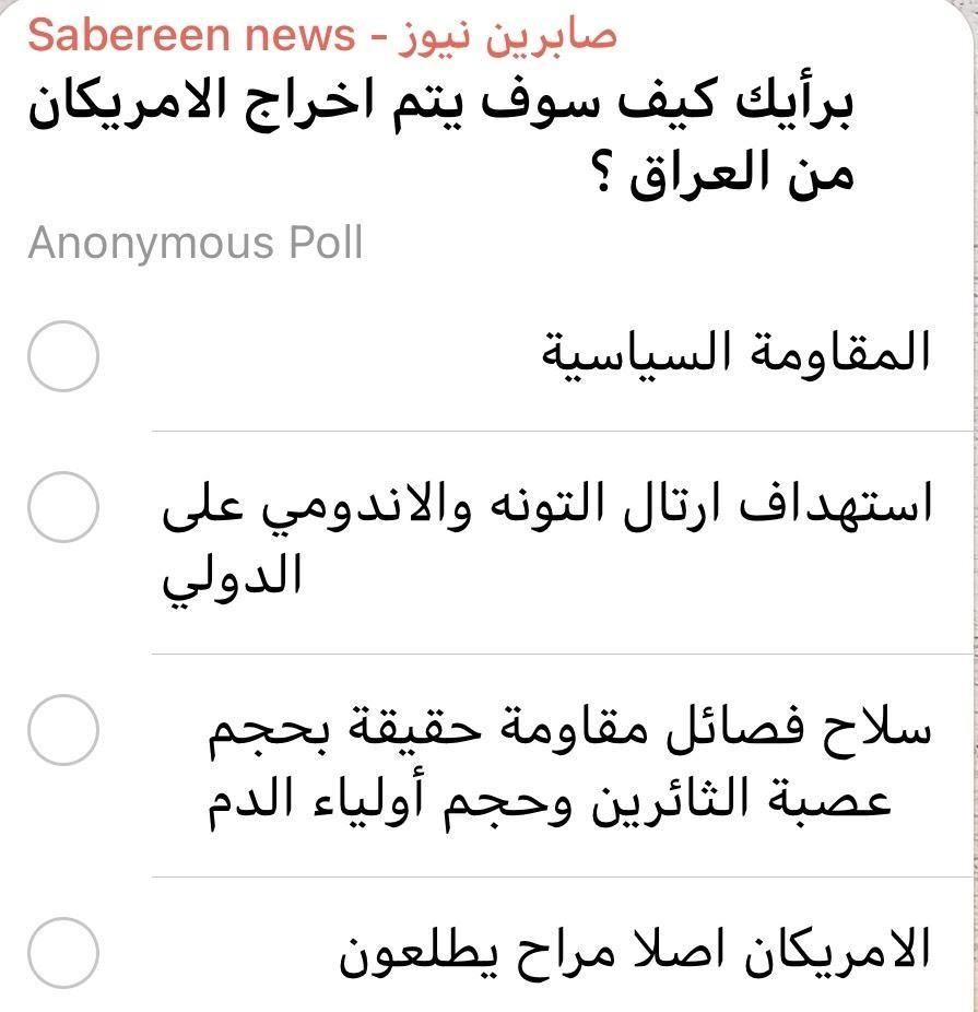 الخطوة الثانية: «عصائب أهل الحق» ترفض هذا النقد. سارعت "صابرين نيوز" التي تصدر من قبل «عصائب أهل الحق» في الرد على ذلك، بنشرها صورة لأبو مهدي المهندس وقاسم سليماني تحت عنوان: "[انتقام] ضيف العراق المظلوم [إشارة إلى سليماني] وشيبتهُ [إشارة إلى لقب المهندس] دمكم بـ أعناق الشرفاء المقاومين". وكان المنشور أيضاً يحمل علامة تصنيف معبرة باللغة الفارسية:"#أتش_به_اختيار" [إطلق النار عند الإرادة] (انظر أدناه). وهذه العبارة هي إشارة إلى شعور «عصائب أهل الحق» بأن الميليشيا لا تحتاج إلى تلقي أوامر من «فيلق القدس» الإيراني لمهاجمة المصالح الأمريكية في العراق: وكان الأمين العام لحركة «عصائب أهل الحق»، قيس الخزعلي، يكرر هذا المسار منذ فترة طويلة، لا سيما تصريحاته بأن "المقاومة قرار عراقي بحت".