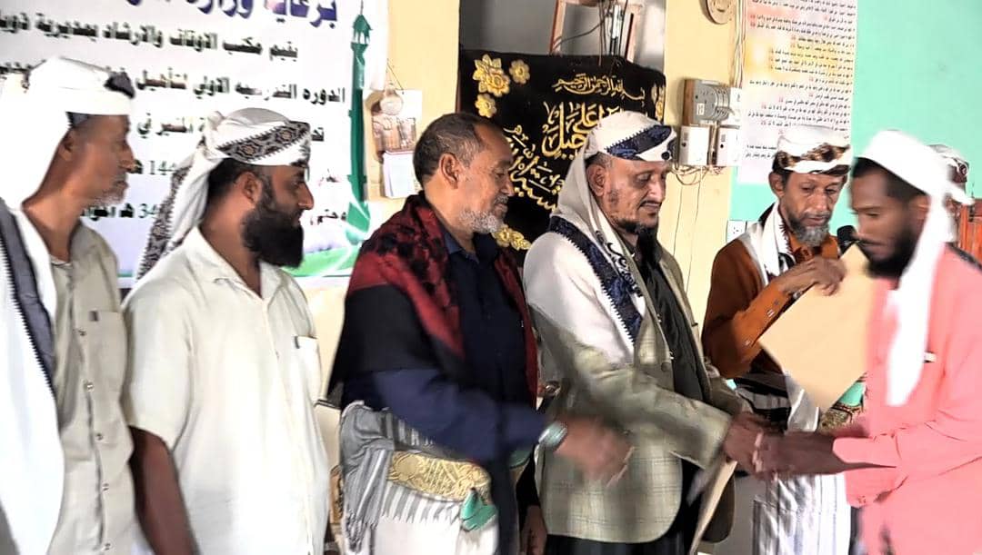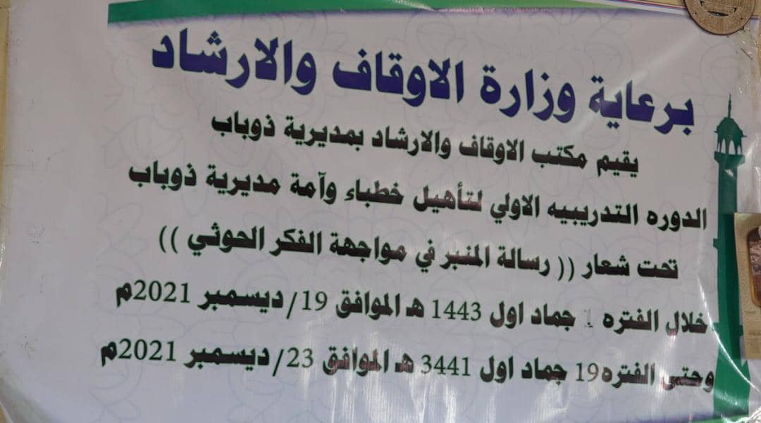 الدورة التدريبية الخاصة بتأهيل الخطباء والوعاظ الشباب في مديرية ذو باب بالساحل الغربي، اختتمت الخميس 23 ديسمبر، والتي نظمها مكتب الأوقاف والإرشاد في المديرية برعاية وزارة الأوقاف والإرشاد، تحت شعار "رسالة المنبر في مواجهة الفكر الحوثي الإرهابي" والتي استمرت أسبوعا كاملا وشارك فيها عدد عشرون متدرباً.