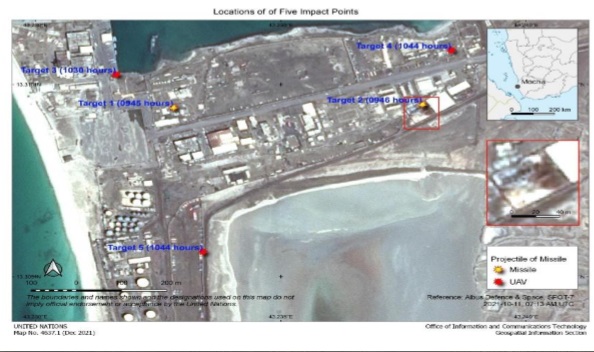 ويضيف التقرير إنه ، في 11 سبتمبر/ أيلول 2021، هوجم ميناء المخا باستخدام خمس طائرات مسيرة وصاروخين (قذيفتين صاروخيتين)، وكان فريق حكومي يزور الميناء للإشراف على تحويله للاستخدام المدني، وسيكون هذا التحويل معلما هاما في تطبيع العلاقات بين القوات المشتركة والحكومة، مع فتح ميناء إضافي للوارادات المدنية على الساحل الغربي.