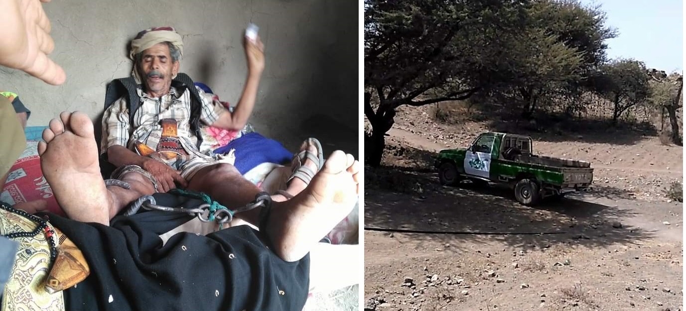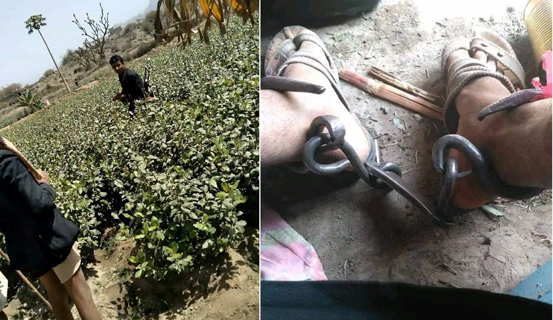 مشرف حوثي يخطف مسنّاً ويكبله بالأغلال على الطريقة الإمامية في قفر إب (صور)