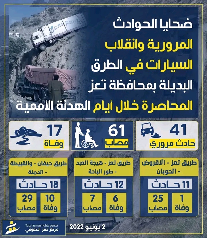 وكشف التقرير عن وقوع نحو أربعين حادثا مروريا في تلك الطرق البديلة والفرعية الوعرة خلال الهدنة، وأصيب في تلك الحوادث نحو 61 مدنيا و17حالة وفاة نتيجة للطرق شديدة الوعورة والتي يحاول المواطنون خلالها الخروج والدخول إلى المدينة.