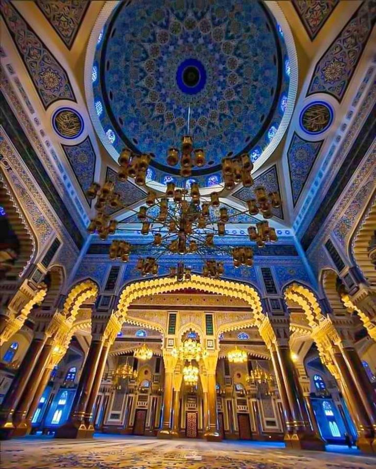 وتتوسط سقف الجامع نماذج بديعة ونادرة من التيجان والأقواس المجصصة، والثريات المتدلية من السقف والقباب بأحجامها وأشكالها المختلفة صُنعت من الكريستال الخالص والنحاس المطعَّم بالبلاتينيوم للحفاظ على رونقه ولمعانه، بحيث توحي هذه الثريات بأشكالها وتصاميمها بنوع من التوافق والانسجام مع النقوش والزخارف الخشبية ذات الطابع الإسلامي، وتزن أكبر نجفة بالجامع وتتدلى من القبة الكبرى 4.5 طن وتحتوي على 81 فانوسا، حفر على كل منها بفراغ فضائي ساحر اسم من أسماء الله الحسنى، ضمن الحيز الدائري المحيط بكل فانوس.
