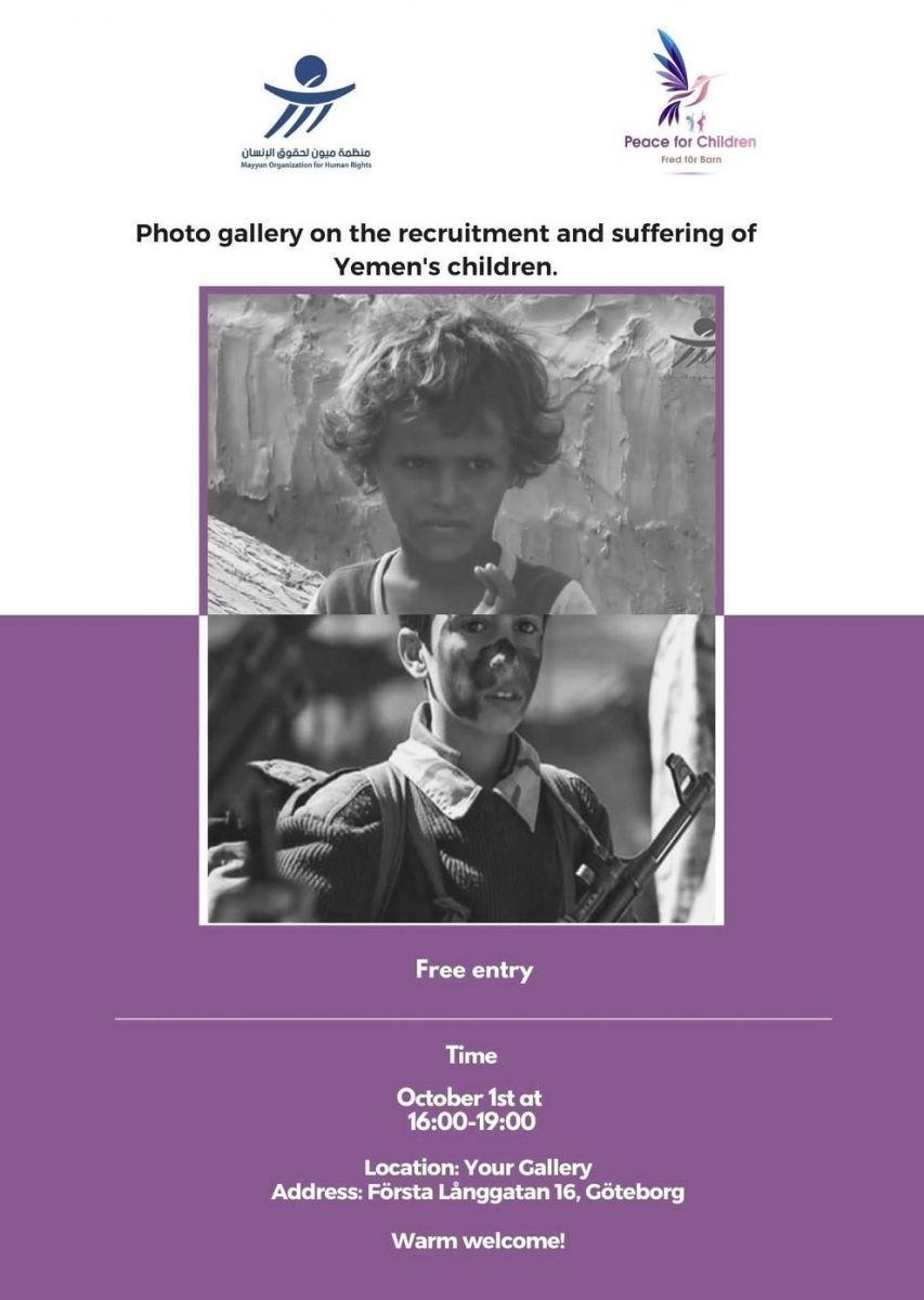 تقيم منظمتا السلام للأطفال وميون لحقوق الإنسان معرضاً للصور في مدينة غوتنبرغ السويدية لضحايا الألغام وتجنيد الأطفال في اليمن.