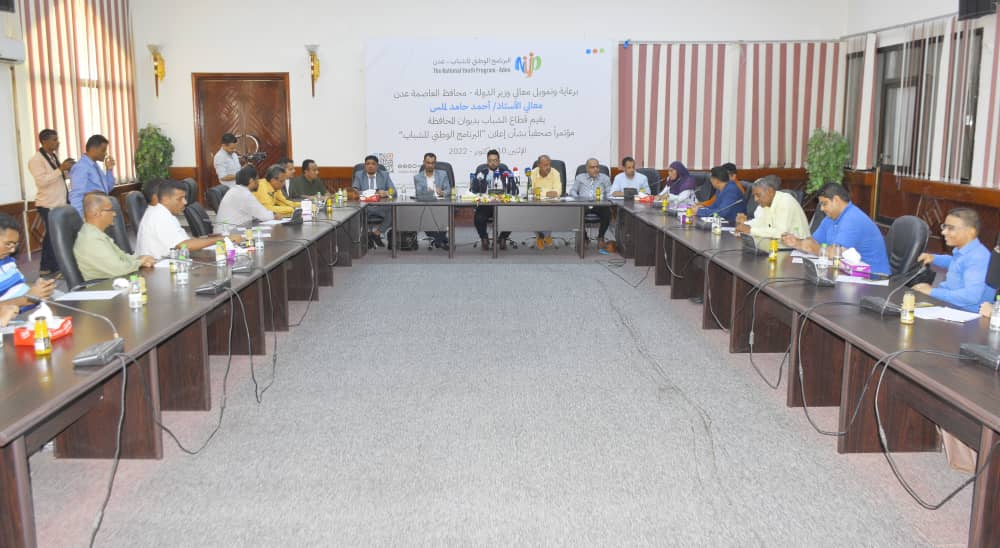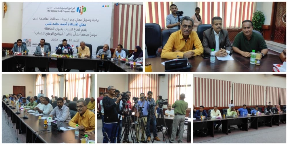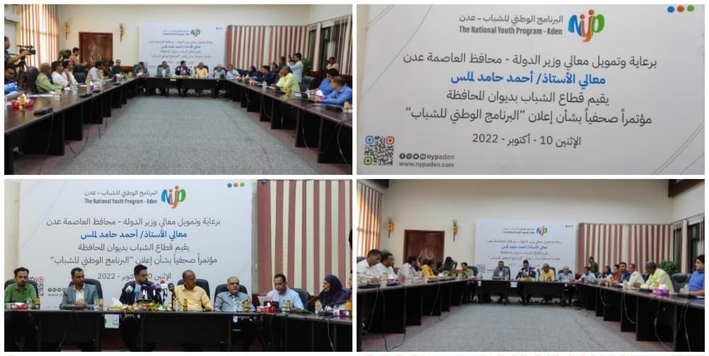 برعاية ودعم وزير الدولة محافظ عدن أحمد حامد لملس، نظم قطاع الشباب بديوان المحافظة، صباح الاثنين، مؤتمراً صحفياً بشأن إعلان البرنامج الوطني للشباب تحت شعار (تأهيل، تدريب، تمكين، قيادة، تنمية).