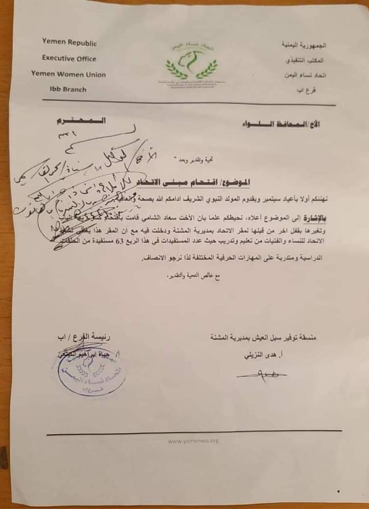 بحسب وثيقة رسمية، رفعت رئيسة فرع اتحاد نساء اليمن بمحافظة إب، حياة الكينعي، شكوى لمحافظ إب الموالي للمليشيا بإقدام القيادية السلالية سعاد الشامي باقتحام مقر الاتحا بمديرية المشنه برفقه عدد من الزينبيات، وقامت بكسر مغلقة الباب وتغييره بقفل آخر بعد إخراج 63 مستفيدة من دورات المهارات الحرفية، دون اكتراث لأي تبعات وعواقب، وطالبت منه الانصاف.
