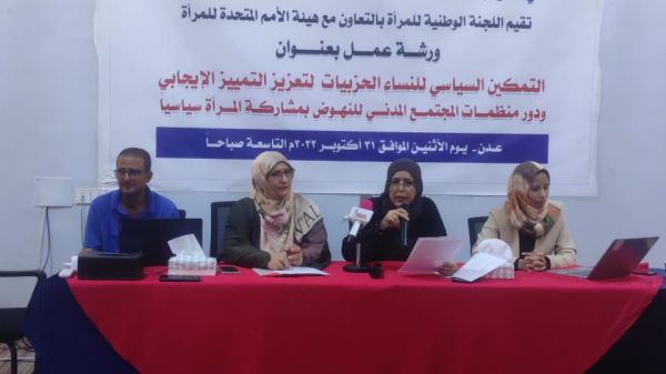 ضمن مشروع التطوير المؤسسي للجنة الوطنية للمرأة في تعميم منظور النوع الاجتماعي ومناهضة العنف ضد المرأة ،نظمت اللجنة الوطنية للمرأة بالتعاون مع هيئة الامم المتحدة للمرأة اليوم بالعاصمة عدن ورشة عمل بعنوان.: "التمكين السياسي للنساء الحزبيات لتعزيز التمييز الايجابي ودور منظمات المجتمع المدني للنهوض بمشاركة المرأة سياسيا ".