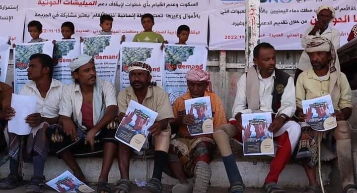 نظم ضحايا الألغام ومنظمات المجتمع المدني بمحافظة الحديدة في الساحل الغربي، السبت 19 نوفمبر/ تشرين الثاني، وقفة احتجاجية، احتجاجاً على ضلوع منظمات أممية في دعم مليشيات الحوثي الإرهابية في زراعة الألغام والمتفجّرات والاشتراك معها في تجويع المدنيين وقتلهم.