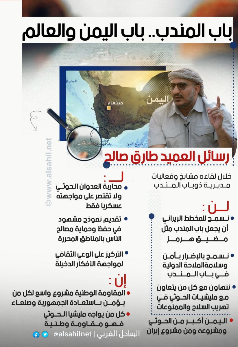 - العميد طارق صالح: سنضرب بيد من حديد كل من تسول له نفسه تهديد التجارة العالمية في باب المندب