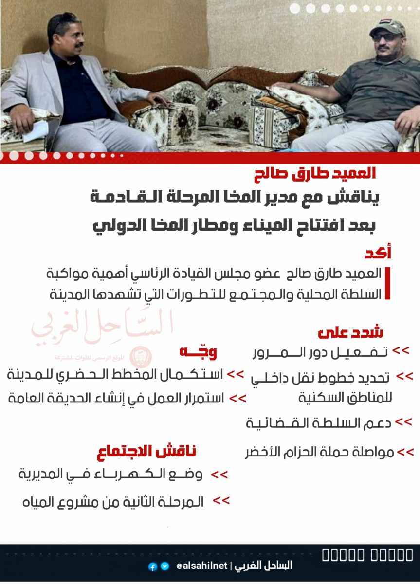 العميد طارق صالح يناقش مع مدير المخا المرحلة القادمة بعد افتتاح الميناء والمطار