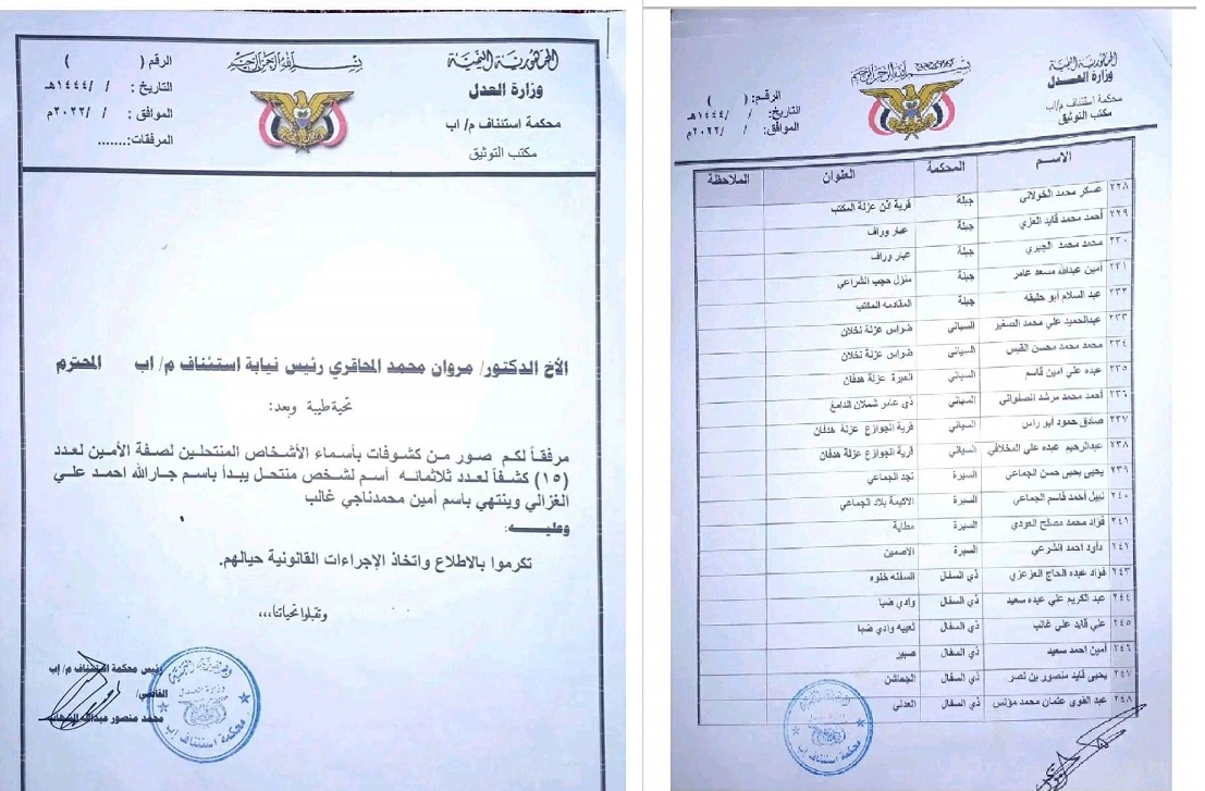 ووفقاً للمذكرة نفسها المرسلة لرئاسة نيابة استئناف إب، خاضعة هي الأخرى للحوثيين، بلغ عدد الأشخاص المنتحلين لصفة الأمين 300 شخص أوردت أسماءهم في نحو 15 كشفاً.