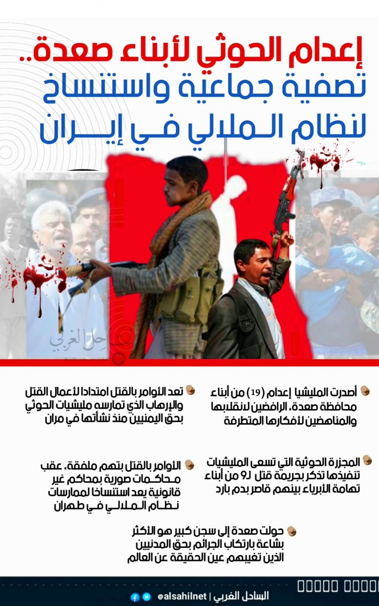 تزامنا، تسود مشاعر الغضب والتنديد في اليمن تجاه حملة إعدامات جماعية لمليشيات الذراع الإيرانية "الحوثيين" وتستهدف المعارضين والرافضين لسلطة وسطوة وقمع وفساد الانقلابيين العنصريين والجماعة الإرهابية.