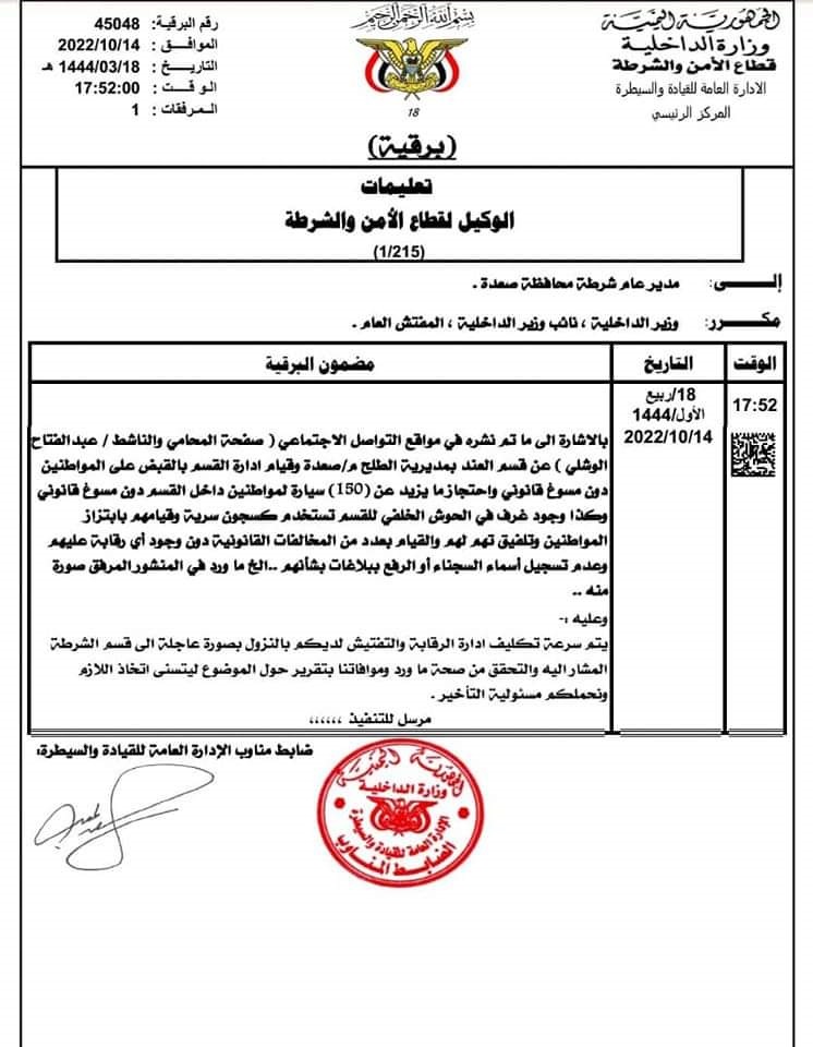 وكان المحامي قال "قسم العند بطلح صعدة يديره مجموعة محششين ويعتقلون الناس ويحتجزون سياراتهم بغرض ابتزازهم ماليا لا غير".