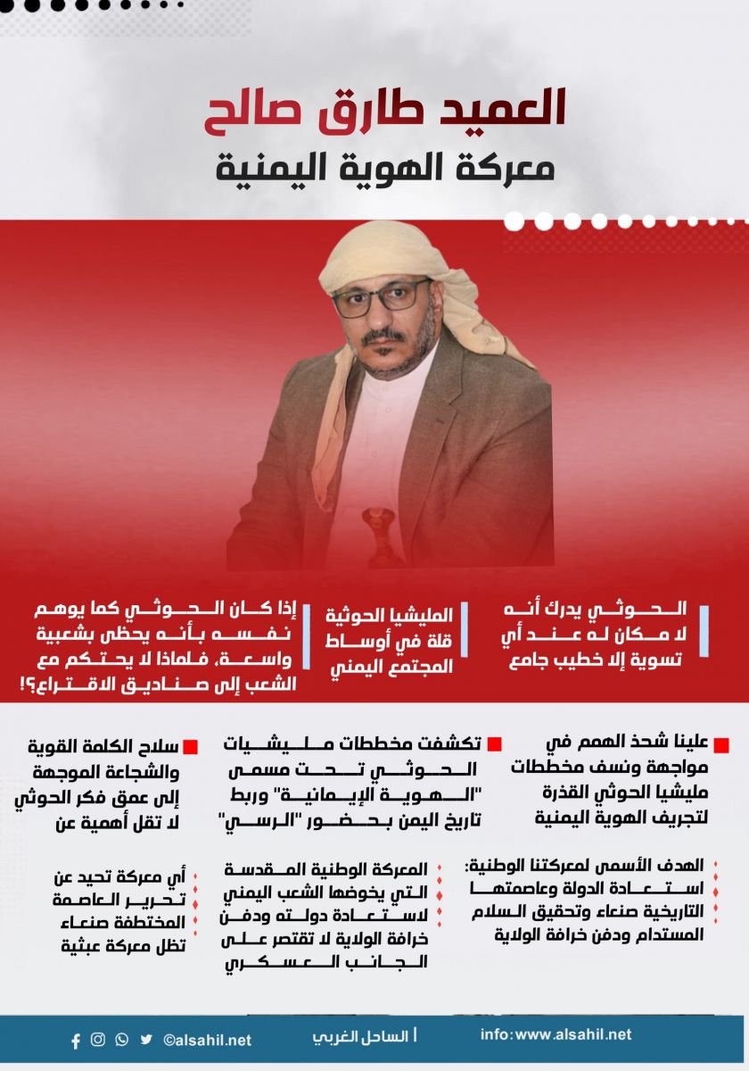 قال العميد طارق، إن المعركة الوطنية المقدسة التي يخوضها الشعب اليمني لاستعادة دولته ودفن خرافة الولاية لا تقتصر على الجانب العسكري، مؤكدًا أن سلاح الكلمة القوية والشجاعة الموجهة إلى عمق فكر الحوثي لا تقل أهمية عن سلاح الدبابة والمدفعية.