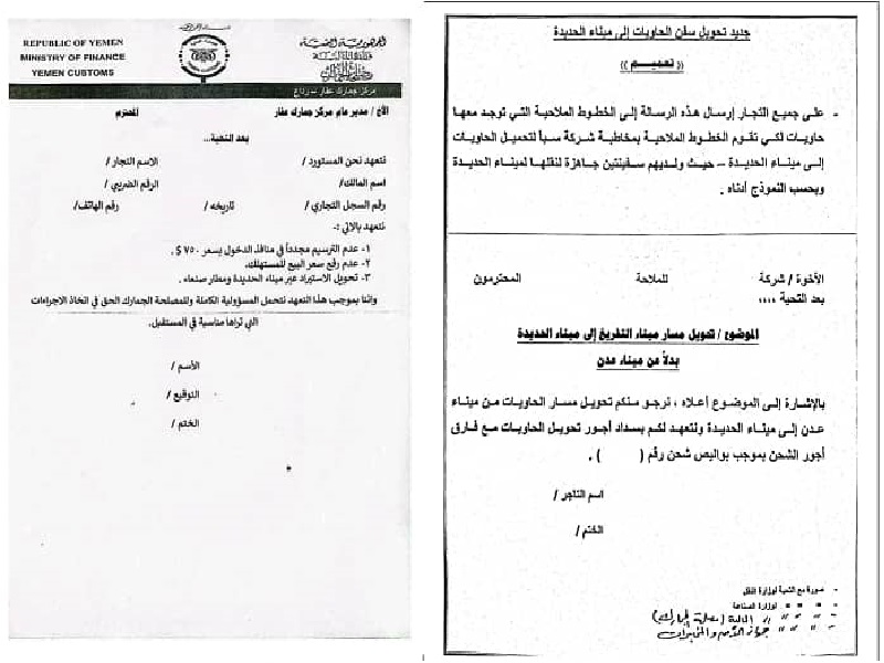 فرضت "تعهدا" بعدم التعامل مع ميناء عدن.. مليشيا الحوثي تجبر التجار على الاستيراد عبر ميناء الحديدة وشركة ملاحة حوثية تحتكر النقل (وثائق)
