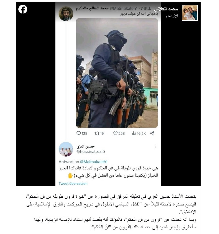 يتحدث الأستاذ حسين العزي في تعليقه المرفق في الصورة عن "خبرة قرون طويله من فن الحكم"، فليتسع صدره لأحدثه قليلاً عن "الفشل السياسي الأطول في تاريخ الحركات والفرق الإسلامية على الإطلاق".