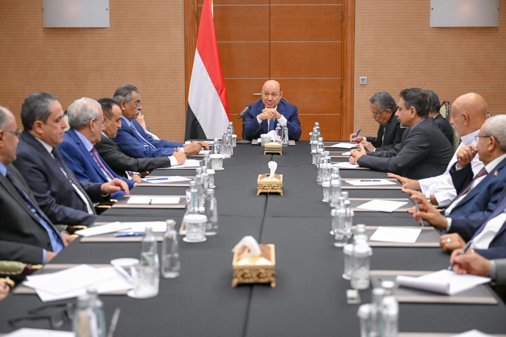 وعرض رئيس مجلس القيادة الرئاسي التحديات المتشابكة التي تواجه المجلس، والحكومة، خصوصا على الصعيد الاقتصادي، والانساني، في ظل توقف الصادرات النفطية عقب الهجمات الارهابية الحوثية، والبدائل الحكومية لافشال اهداف تلك الهجمات الاجرامية.