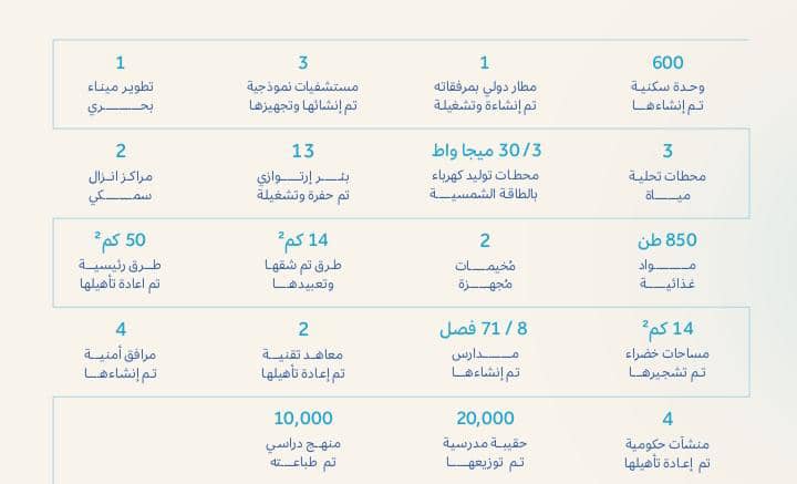 إنشاء 600 وحدة سكنية، مطار المخا الدولي، 3 مستشفيات نموذجية، تطوير ميناء المخا الدولي، 3 محطات تحلية مياه، 13 بئرا ارتوازية، 3 /30 ميجاواط محطات توليد كهرباء بالطاقة الشمسية، 2 مراكز انزال سمكي، 14كم٢ شق طرق وتعبيدها، 50كم٢ طرق رئيسية تم تأهيلها، 850 طن مواد غذائية، 2 مخيمات مجهزة، 14كم٢ مساحة خضراء وتشجير، 8 مدارس تم إنشاؤها، 2 معاهد تقنية تم تاهيلهما، 4 مرافق أمنية تم إنشاؤها، 4 منشآت حكومية تم تأهيلها، 20000 حقيبة مدرسية، 10000منهج دراسي تم طبعه.