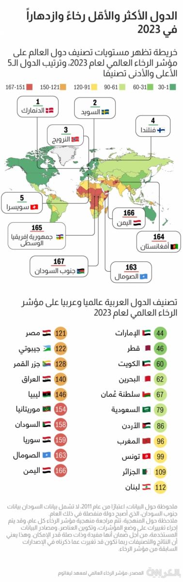 وفي أعلى المؤشر، تصدرت الدنمارك القائمة، متبوعة بالسويد والنرويج وفنلندا وسويسرا، في حين جاءت جنوب السودان واليمن وجمهورية إفريقيا الوسطى وأفغانستان في ذيل المؤشر.