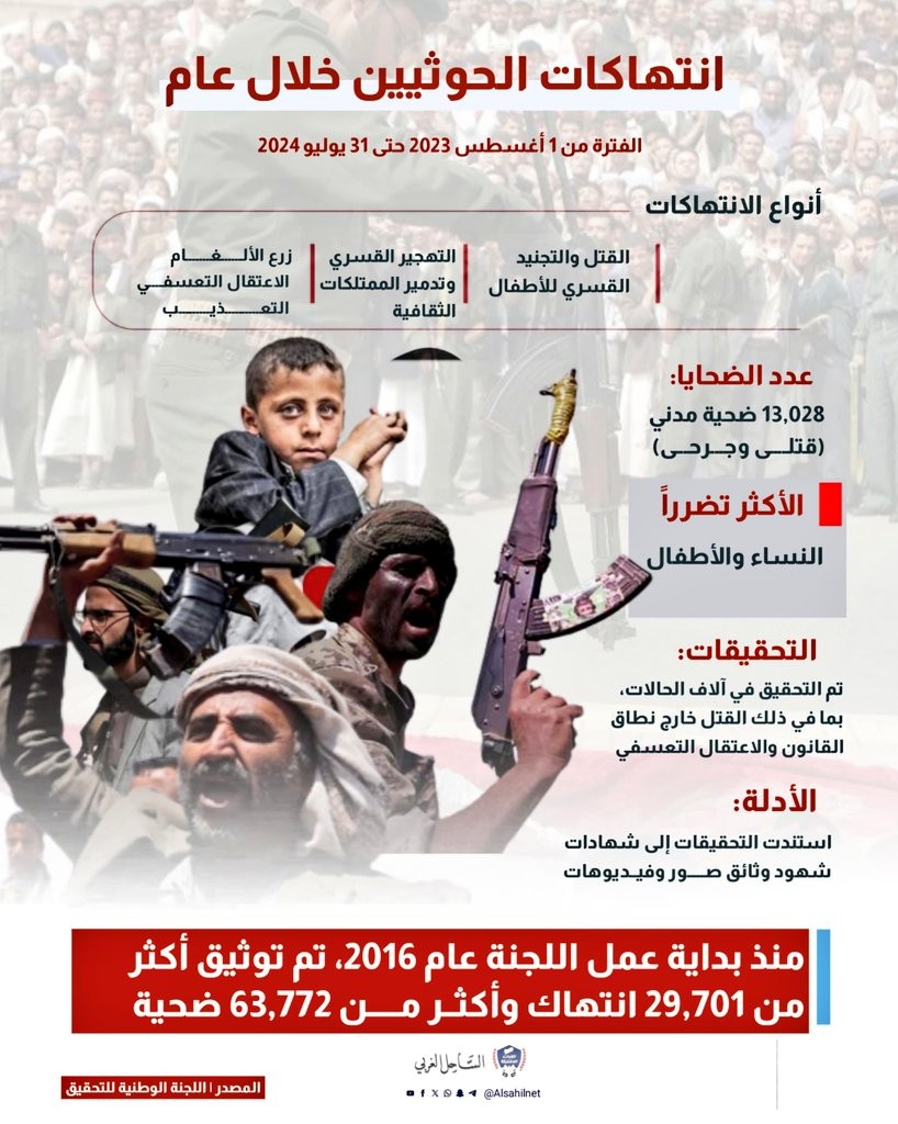 إنفوجرافيك| عام من الانتهاكات الحوثية: 13,028 ضحية مدنية في مرمى العنف والاعتداء