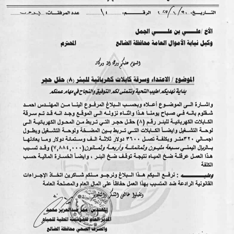 وجهت إدارة المؤسسة العامة للمياه والصرف الصحي بمحافظة الضالع بلاغاً رسمياً إلى وكيل نيابة الأموال العامة، والنسخة منها إلى وزير المياه والبيئة ومحافظ المحافظة، وأعلنت عن