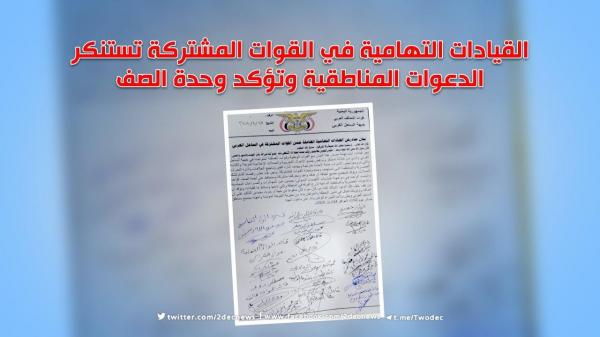 عبرت القيادات العسكرية المنضوية في إطار القوات المشتركة بالساحل الغربي من أبناء تهامة عن إدانتها واستنكارها للدعوات المناطقية والحملات الإعلامية المزيفة والكاذبة والتي تروج لها بعض