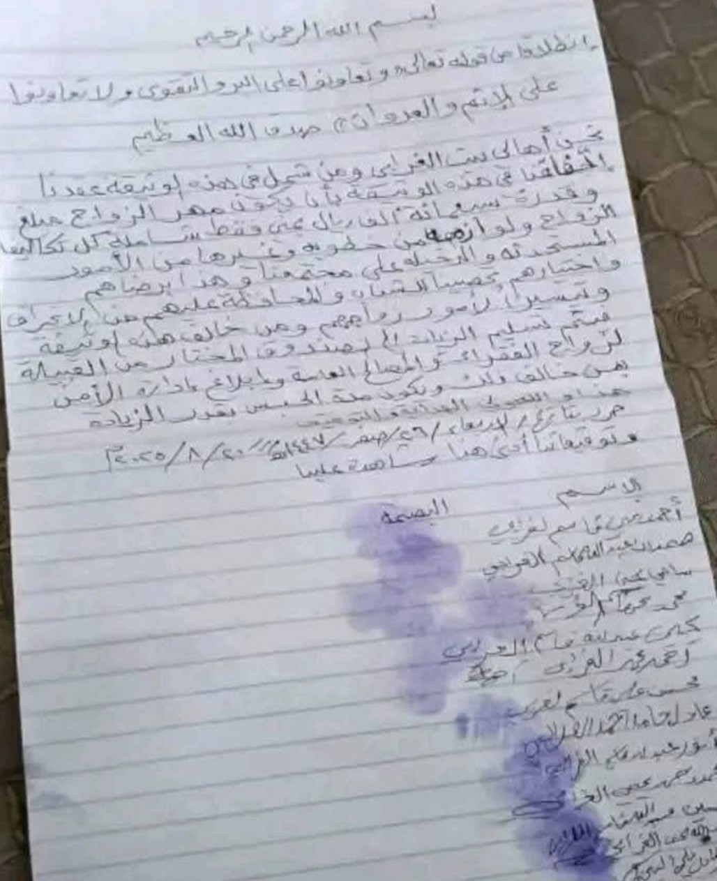 تداول ناشطون وثيقة صادرة عن أهالي منطقة بيت الغرابي في مديرية المدان بمحافظة عمران، أقرت تحديد مبلغ 700 ألف ريال يمني مهراً موحداً للزواج، شاملاً جميع