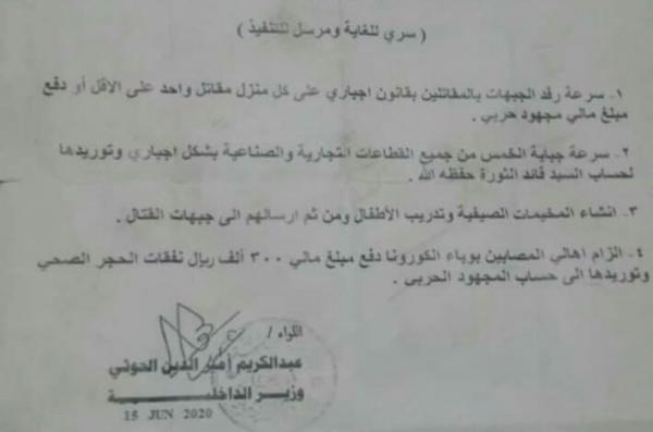 قرارات حوثية جديدة حول الخمس والتجنيد ومصابي كورونا ( وثيقة)