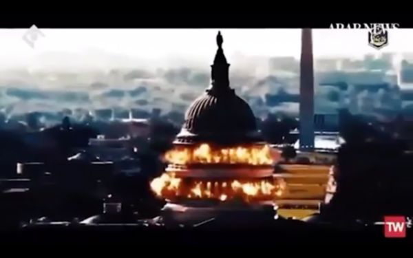 بث التلفزيون الإيراني الرسمي شريط فيديو دعائياً يظهر صاروخًا يفجر مبنى الكابيتول الأمريكي، وفي وقت لاحق دعا الحوثيون التابعون لإيران إلى الهجوم لانتزاع مكة المكرمة، في