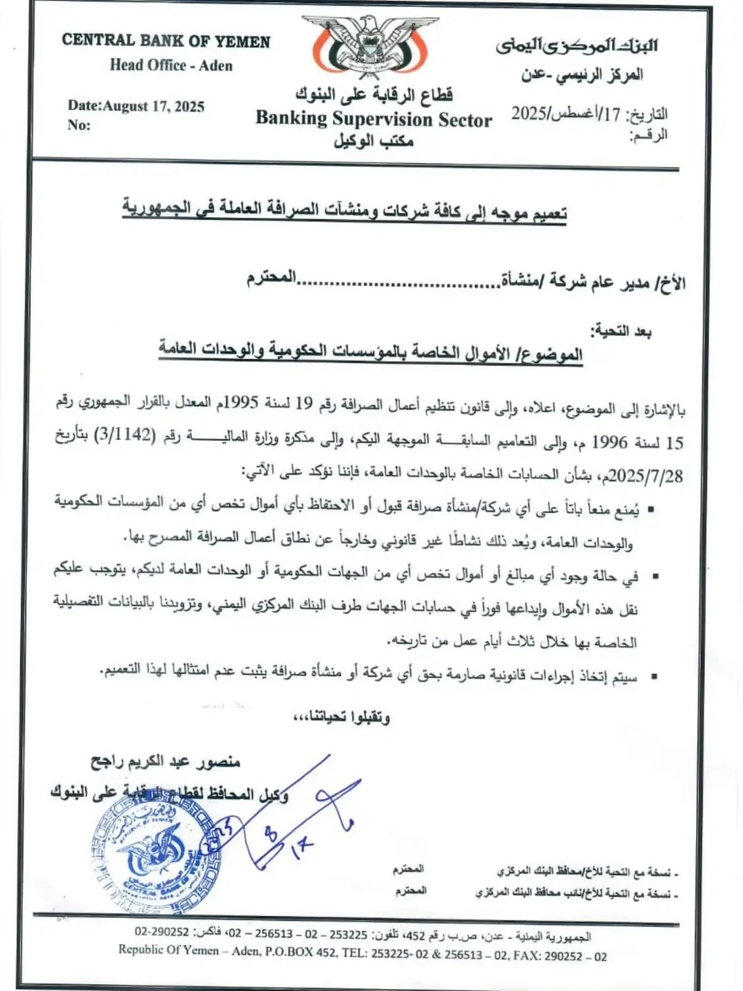 وأكد التعميم الصادر عن قطاع الرقابة على البنوك، استناداً إلى قانون تنظيم أعمال الصرافة رقم (19) لسنة 1995م والمعدل بالقرار الجمهوري رقم (15) لسنة 1996م، وكذا مذكرة وزارة المالية بتاريخ 28 يوليو 2025م، أن قيام شركات الصرافة بقبول أو الاحتفاظ بأموال عامة يعد نشاطاً غير قانوني وخارج نطاق الترخيص الممنوح لها.
