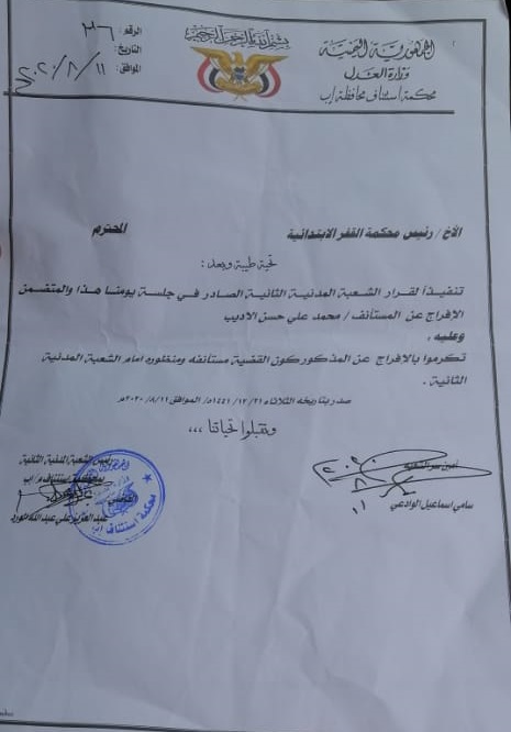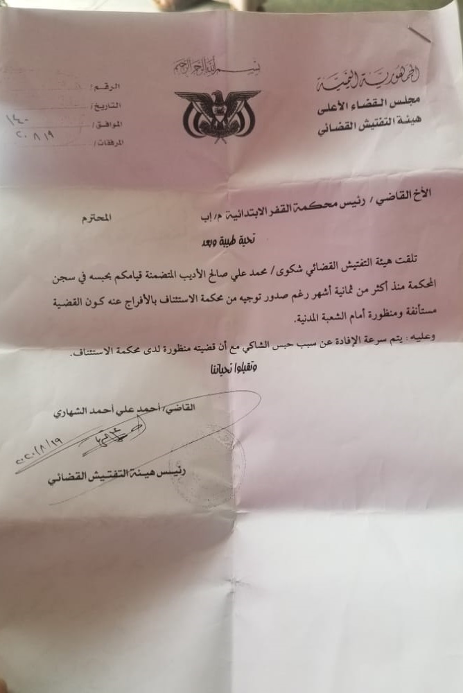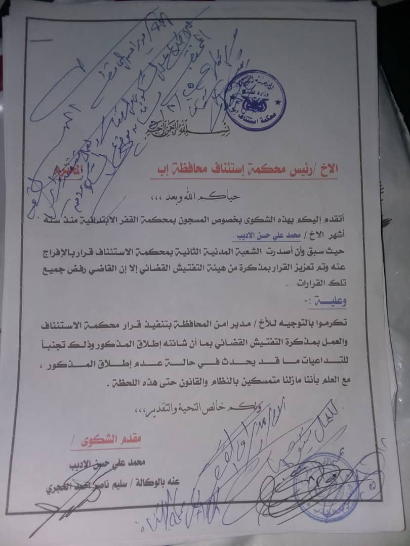 ومع ذلك فقرار المجلس ليس الوحيد الذي رفضه "إياد ملفي"؛ إذ تبين الوثائق رفضه قبل ذلك مذكرة صادرة عن محكمة استئناف محافظة إب بتاريخ 11 أغسطس/ آب 2020، وأخرى في 25 من ذات الشهر، موسومة بختم محكمة الاستئناف وإدارة أمن إب، وهما بخصوص الإفراج عن "محمد على الأديب 75 عاماً"، الذي احتجزه ملفي في مبنى محكمة القفر "تعصباً مع أحد أقاربه" ثم تمنع عن إطلاق سراحه إلى أن توفي هناك.