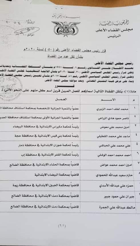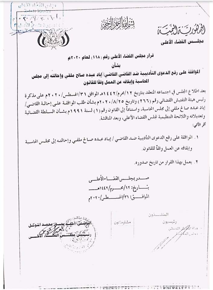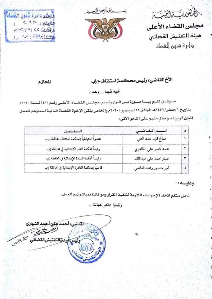وبحسب الوثائق أصدر مجلس القضاء الأعلى الخاضع لسلطة الأمر الواقع بصنعاء في 19 سبتمبر/ أيلول 2020، قراراً يقضي بتعيين محمد ناصر الظاهري رئيساً لمحكمة القفر الابتدائية بمحافظة إب خلفاً للقاضي "المحال إلى مجلس تأديبي والموقوف عن العمل" إياد صالح ملفي.